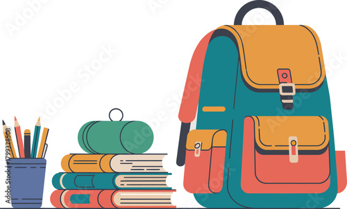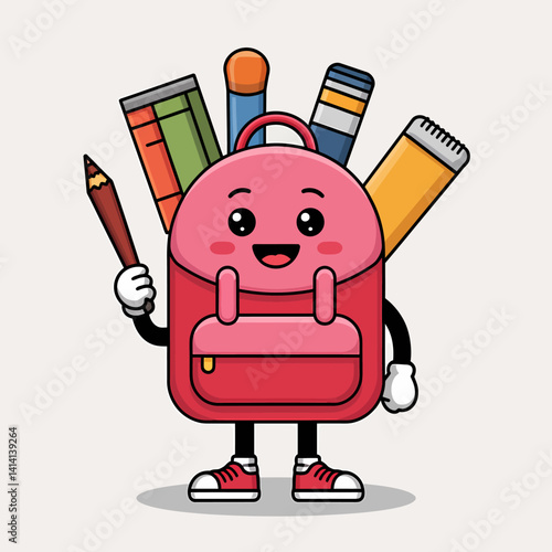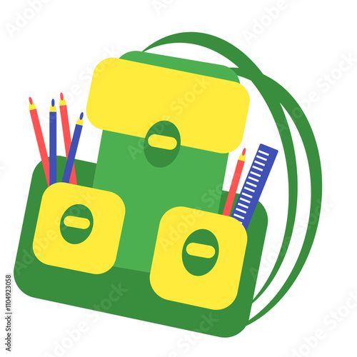 Red backpack with school supplies, vector isolated illustration. Realistic rucksack with zipper, pockets, straps. Children school bag with notebook, ruler, scissors, pens, pencils, paint brushes.