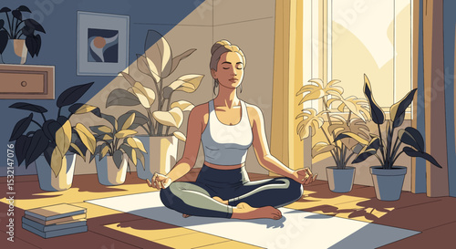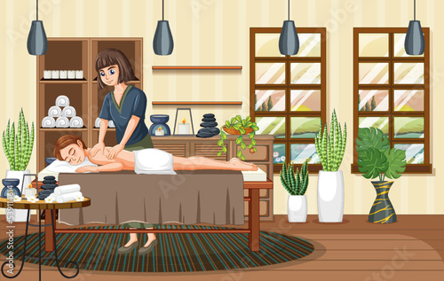 Relaxed woman getting thai massage in wellness spa concept vector illustration. Massage therapy and body treatment poster.