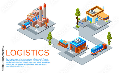 Relocation service web banner design template. Vector isometric new house, loaders unloading furniture and carton boxes from delivery truck. Moving, transportation, home removal concepts.