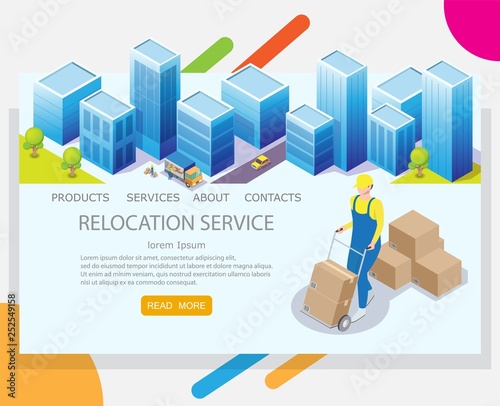 Relocation service vector website template, web page and landing page design for website and mobile site development. Online moving or relocation services concept.