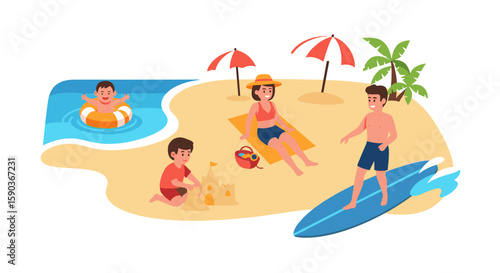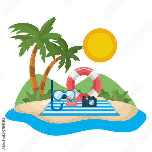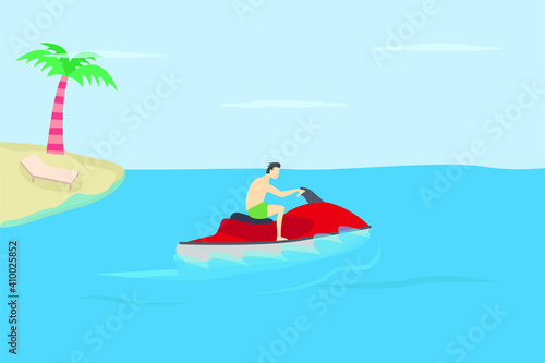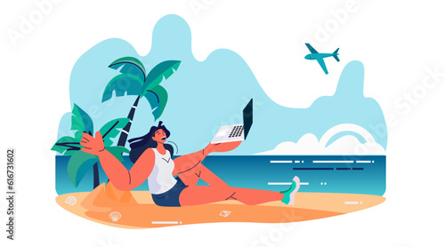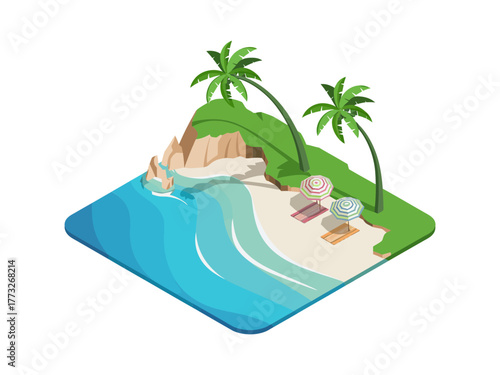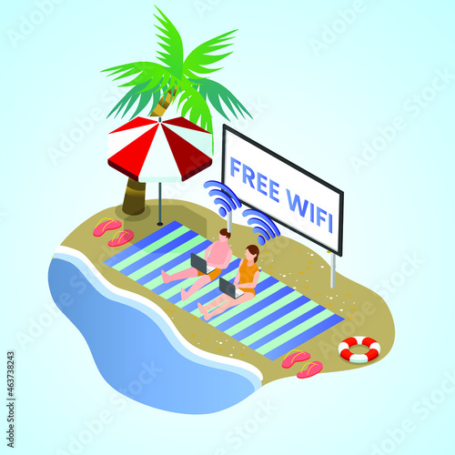 Remote job, freelance concept. Isometric mobile phone with business man working during relax at beach resort of topical island 3d vector