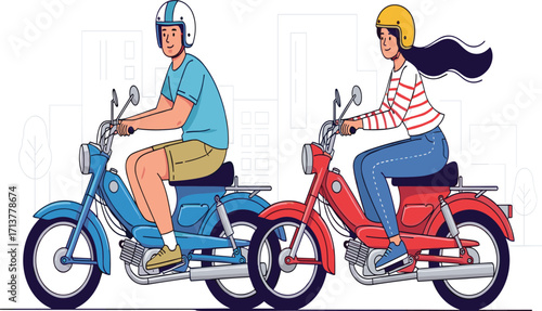 Male and female characters riding bike, holding key, lock, dollar coin, vector illustration. Bike sharing, rental bicycle service concept for web banner, website page etc.