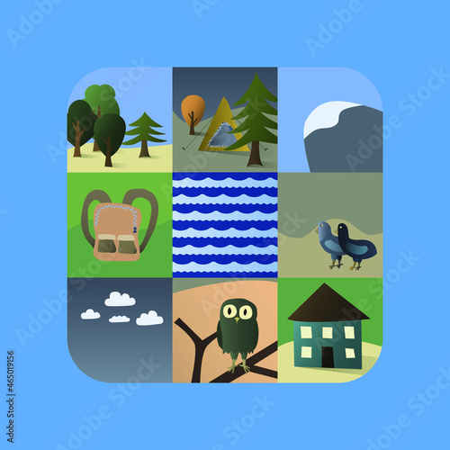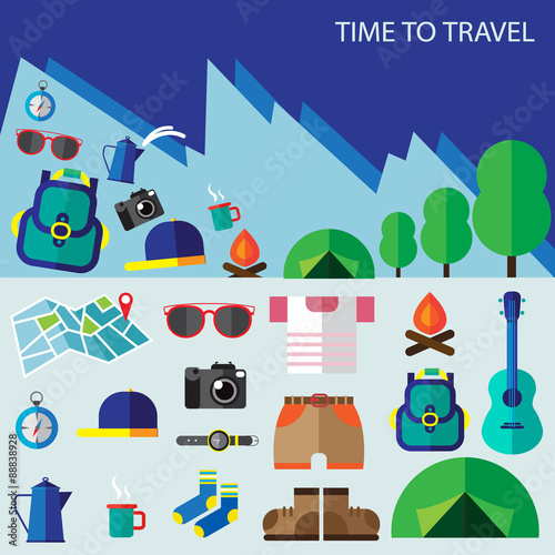 Rest in Egypt vector flat style design illustration. Egyptian pyramids, swimsuit, sunscreen, glass of cocktail, sunglasses, exotic fish. Travel to Egypt composition for web banner, website page etc.