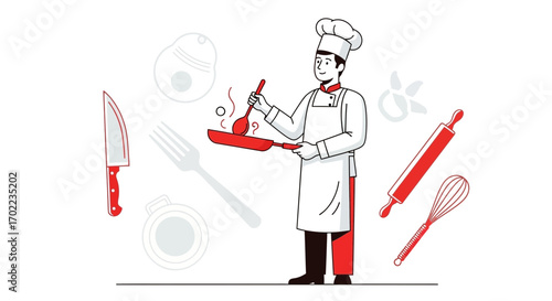 Young man in chef uniform and cap juggling kitchenware, fruits. Vector flat illustration isolated on white background. Restaurant cook, professional cooking concept for web banner, website page etc.