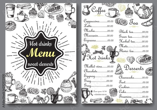 Restaurant hot drinks menu design with chalkboard background. Vector illustration template in vintage style. Hand drawn style.