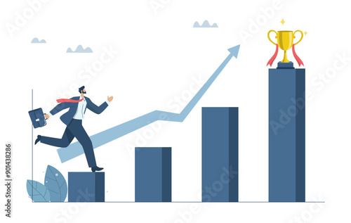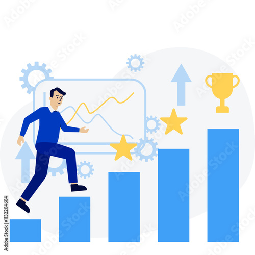 Robot machine winner standing on bar chart top and businessman falling down from it, flat vector illustration. Robot with trophy cup celebrating victory. Artificial intelligence.