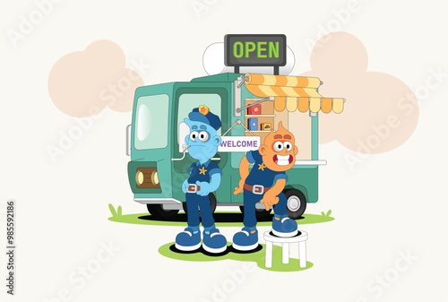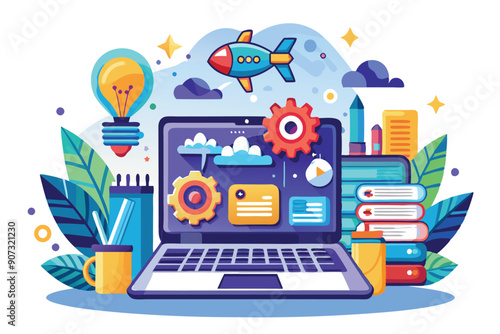 Robotics vector flat illustration. Robot, industrial robotic arm, charts, graphs dashboard, keyboard, dollar coins, flash drives. Business process automation concept for web banner, website page etc.