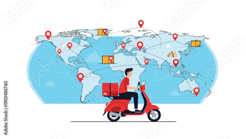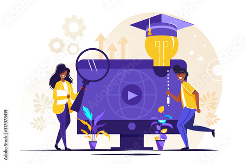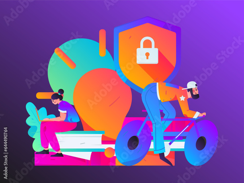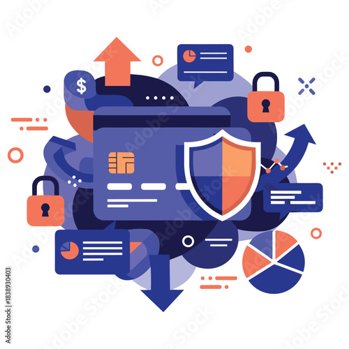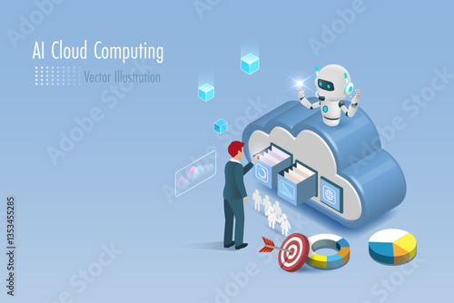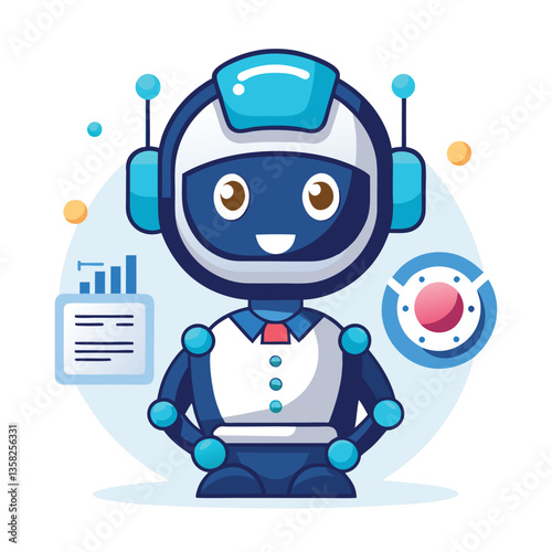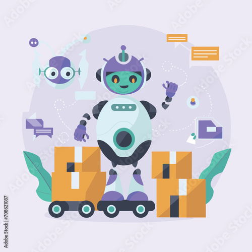 Robotics vector flat illustration. Robot, industrial robotic arm and hand, charts, graphs, joystick, dollar coins. Business process automation technology concept for web banner, website page etc.