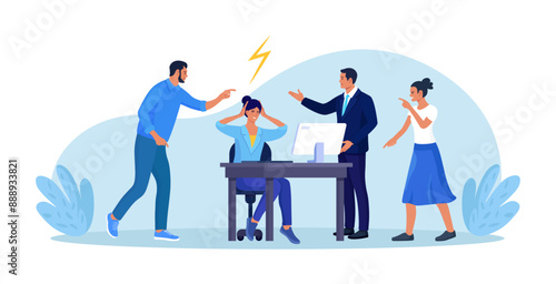Vector illustration of musicians playing guitars and drum on concert stage illuminated with spotlights. Rock band concert flat style design.
