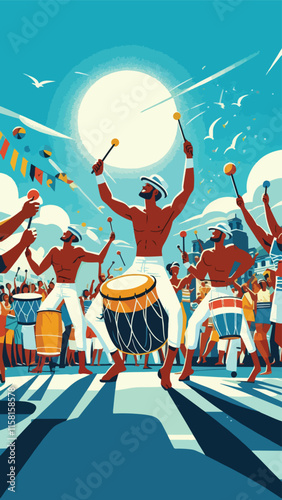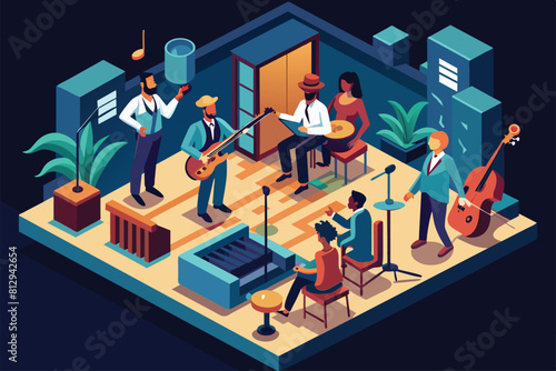 Rock band live music concert vector illustration. People dancing to music and drinking beer. Club party design element in flat style.