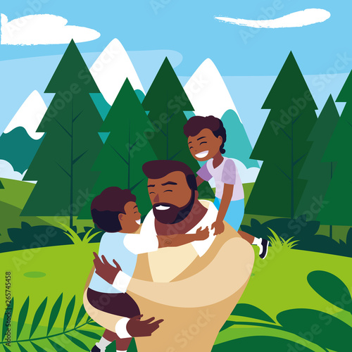 Romantic couple sitting by the fire in forest, flat vector illustration. Happy tourist people going camping, hiking, trekking. Forest camp, picnic, summer outdoor activity.
