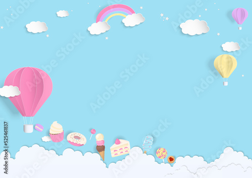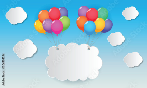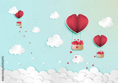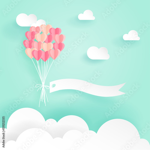 Layered paper cut style sky with fluffy clouds and happy couple holding hands, vector illustration in paper art craft style. Romantic couple background with copy space for web banner, website page etc