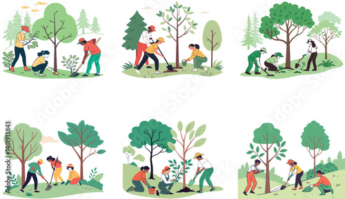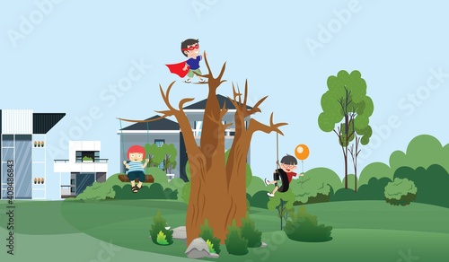 Rope adventure park flat vector illustration. Happy adult people and children climbing trees, overcoming obstacles enjoy extreme recreation time outdoors