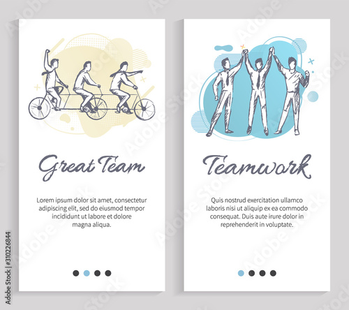 Russian stereotypes. Bear with balalaika, russian girl in traditional dress, caviar, teapot. Mobile app screens. Vector banner template for website mobile development. Web site design illustration.