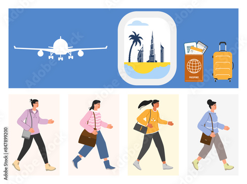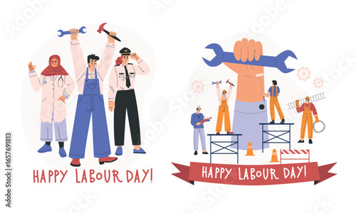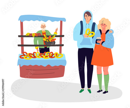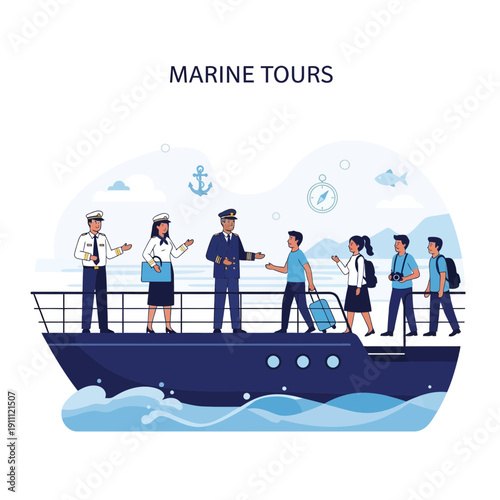 Ship with captain and sailors on deck, vector illustration. Seamen dropping anchor, holding life buoy. Cruise, navigation, maritime, shipping concept for web banner, website page etc.