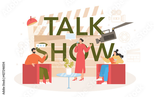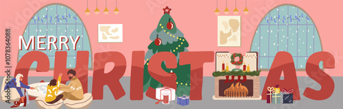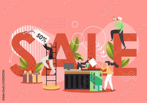 Sale in capital letters, shop assistants with price tag, megaphone, cashier, shopper woman buying gift using credit card, vector flat illustration. Sales and discounts, seasonal offers promotion.