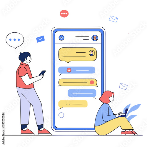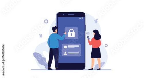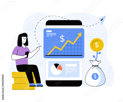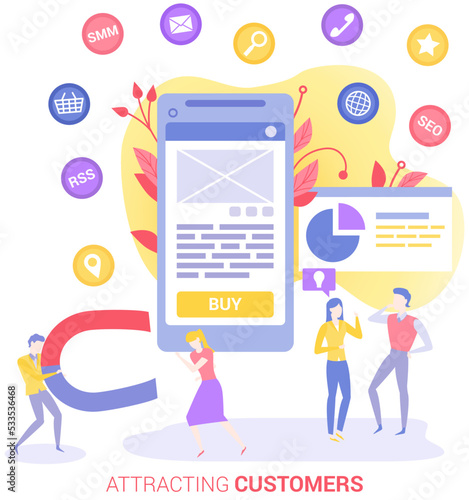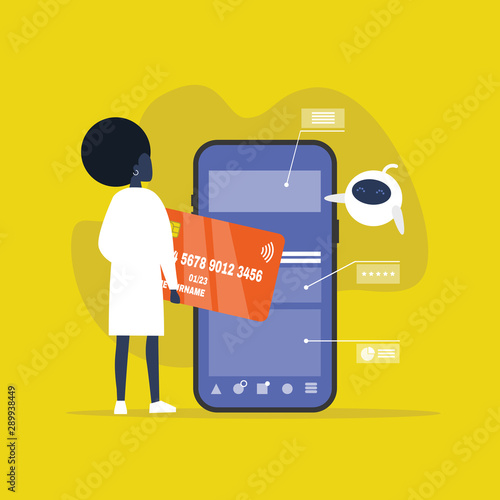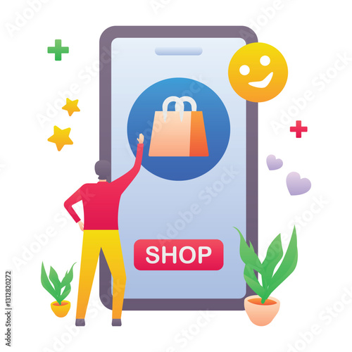 Sale promotion gift box on smartphone screen, woman with shopping bags, credit card, flat vector illustration. Online shopping, internet payment technologies.