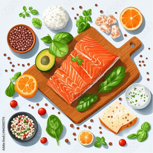 Salmon red fish raw steaks, fillet with lemon slices and spicy herb, vector realistic illustration. Fresh organic seafood composition for restaurant, sushi bar menu etc.