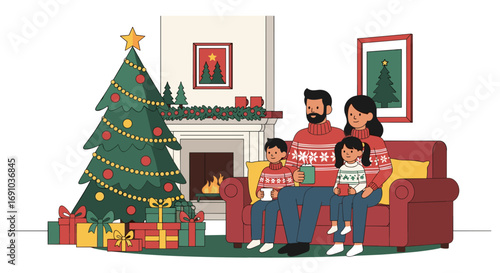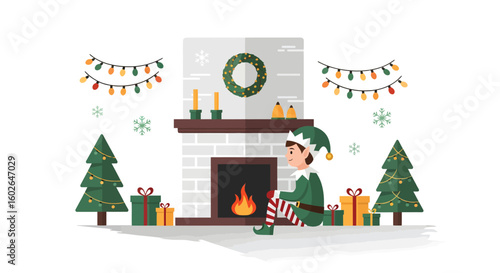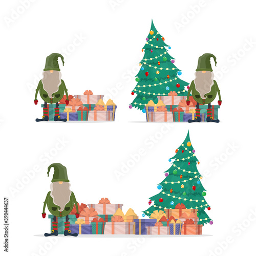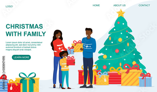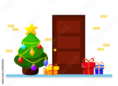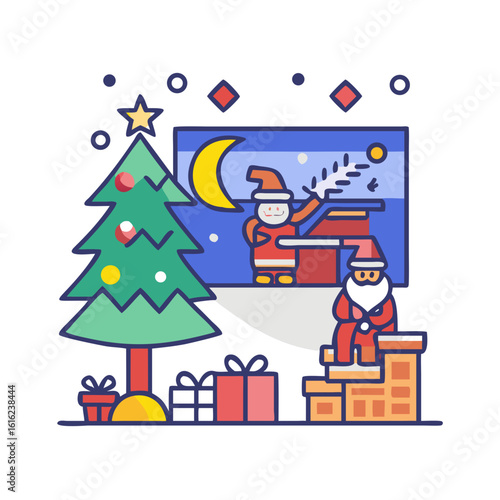 Santa Claus giving gift box to happy girl kid, flat vector illustration. Living room interior with decorated Christmas tree and gifts. New Year night. Christmas holidays celebration.