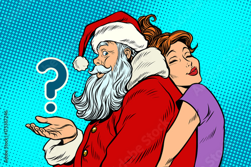 Santa pin up girl in blue dress holding bag with gifts. Vector illustration in comic pop art style. Christmas holidays concept poster.