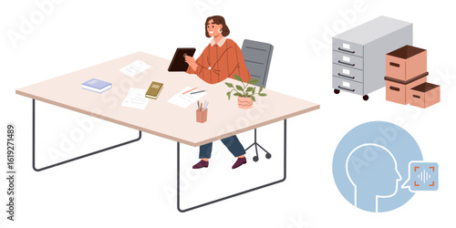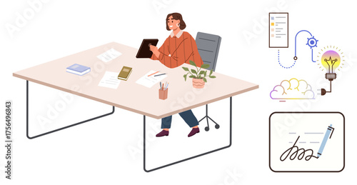 Save time vector. Productivity concept. Man freelancer working laptop sitting on business document near hourglass isometric 3d design