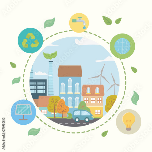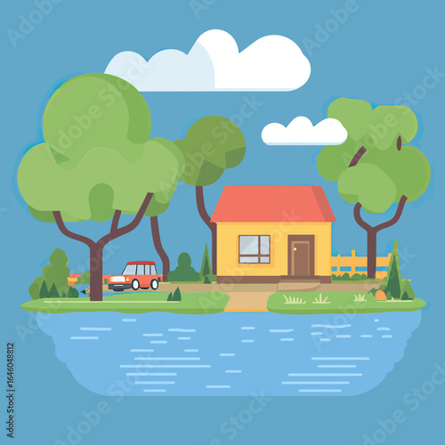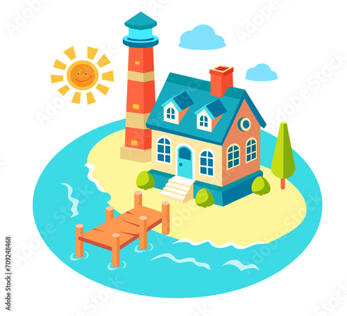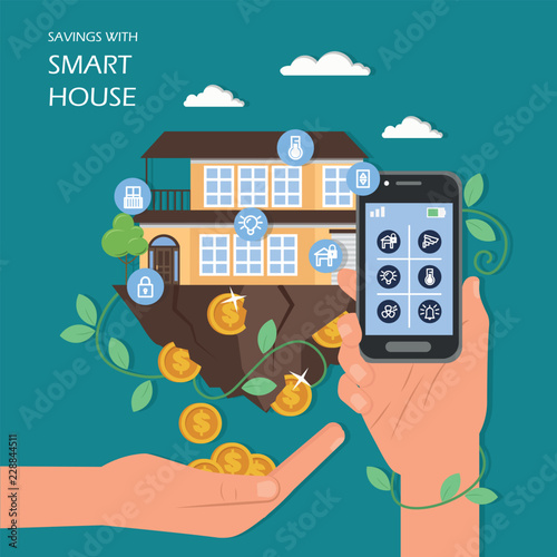 Savings with smart house concept vector flat illustration. House with automated home security, lighting and other systems controlled remotely, dollar coins falling out of building into human hand.