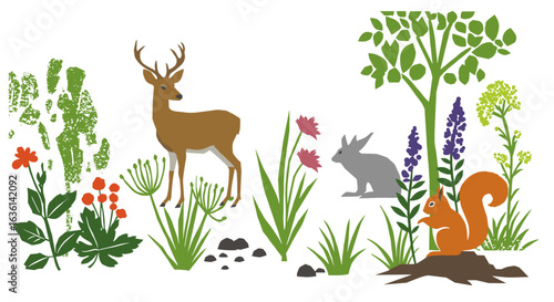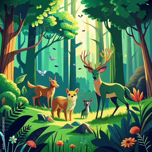 Scared wild animals running and birds flying away from wildfire in forest scene. Nature conservation, environmental protection, defense of national parks vector illustration