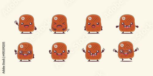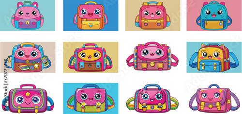 School bag mascot with different emotion vector set. Happy, angry, confused, shocked and excited emoticon character. Funny backpacks reading book and learning illustration. Back to school design