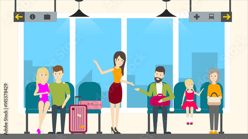 School canteen scene set, flat vector isolated illustration. School children having lunch sitting at table, staying in line, carrying tray with meal, buying snacks from food vending machine.