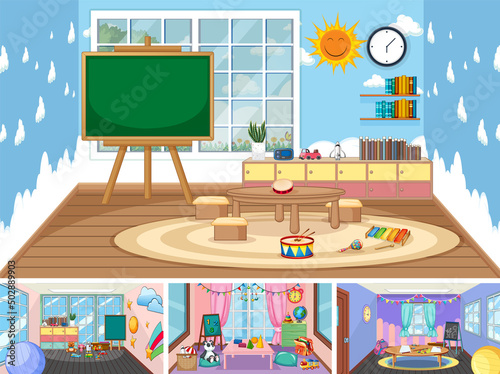 Vector set of posters with teachers, school children at lesson, in sports ground, classroom and hallway interior with furniture, lockers and school supplies. School concept flat style design elements.