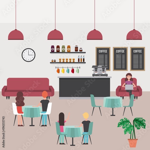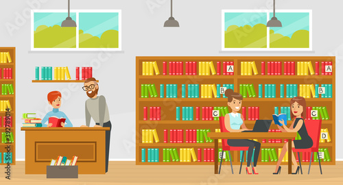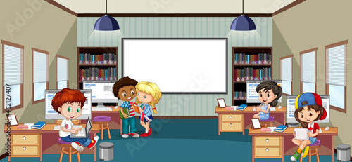 Vector illustration of school teacher sitting at the table and pointing at blackboard, school kids sitting at the desks. Classroom interior. School concept design element in flat style.