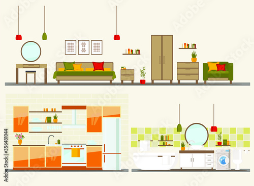 Vector illustration of teachers and school children, classroom interior with furniture and supplies. School concept flat style design elements.