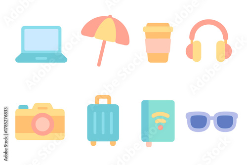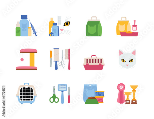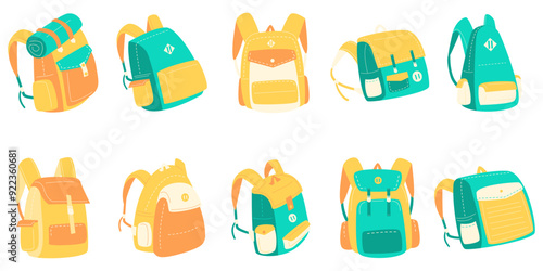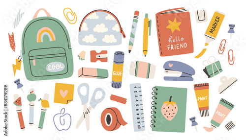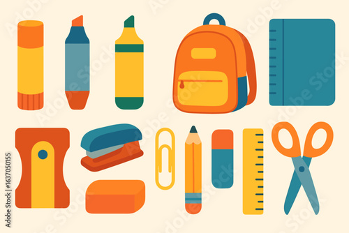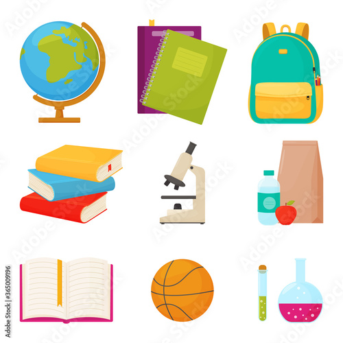 School set vector. Education supplies icon flat illustration. Stationery equipment and study accessories as book, schoolbag, pen and pencil, ruler, alarm clock, magnifying glass and paintbrush