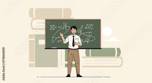 Vector illustration of teacher female with pointer standing next to chalkboard. School concept design element in flat style.