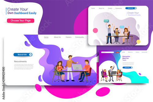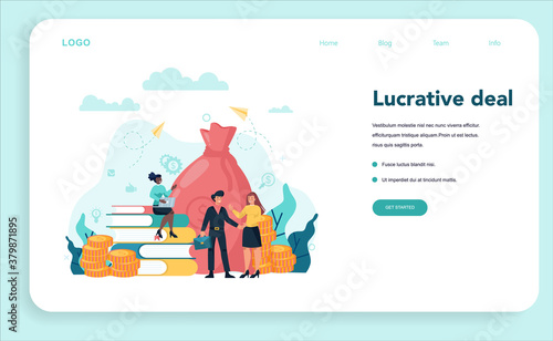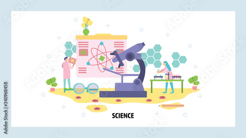 Science and technology poster. Scientists, microscope, research, physics. Atom structure. Vector web site design template. Landing page website illustration