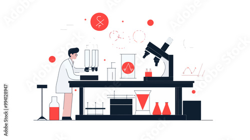Vector flat style design poster with chemistry, physics, biology science concept design elements, icons. Laboratory glassware and science equipment.