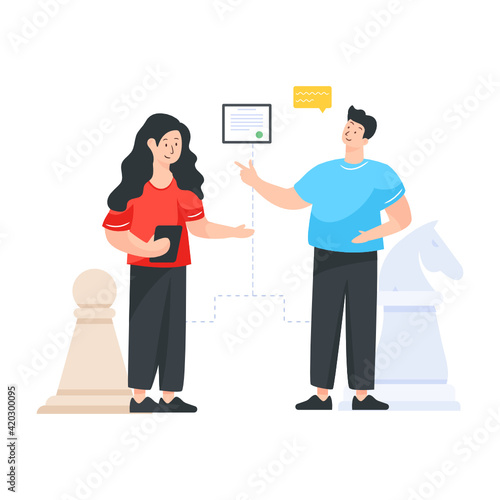 Vector illustration of scientists man and woman working at science lab. Science people concept flat style design element, icon isolated on white background.