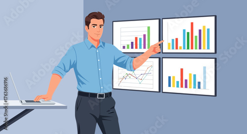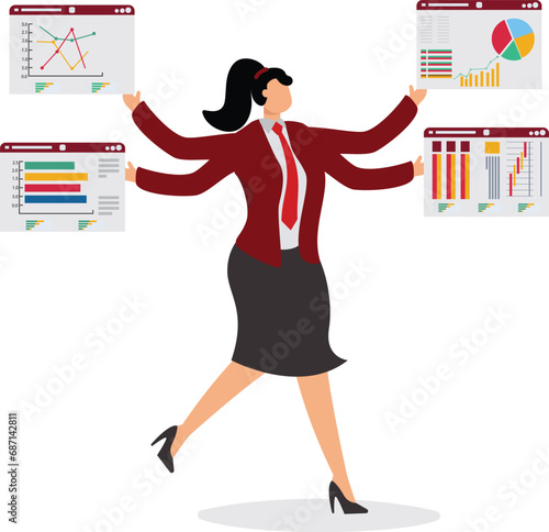 Woman standing next to laboratory cabinet with lab tubes, flasks, folders on shelves, vector flat illustration isolated on white background. Science experiment, education, scientific research.