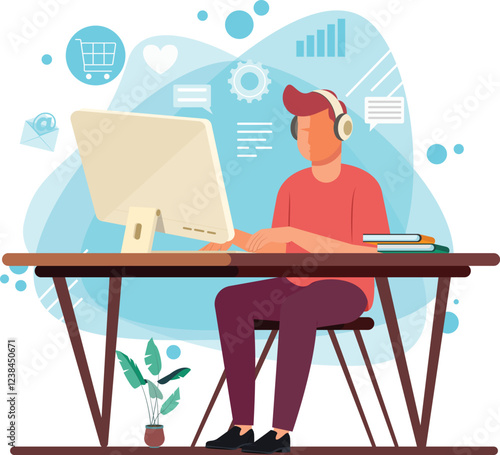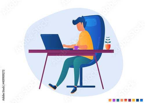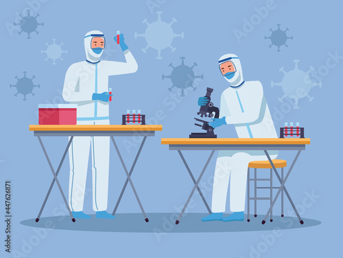 Woman scientist or lab attendant working in science laboratory using microscope and lab flask, vector flat isolated illustration. Scientific research, experiment concept for web banner, website page.