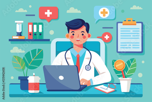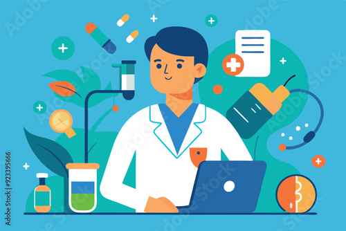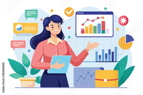 Science research laboratory scene. Scientist female character conducting chemistry experiment, flat vector illustration. Woman in lab coat using laboratory flasks, beakers, burner. Science, education.