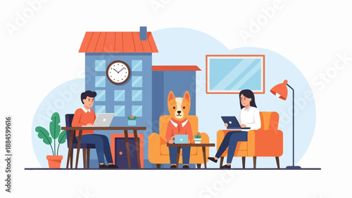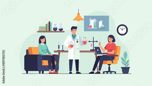 Scientists conducting scientific experiments in chemistry lab, flat vector illustration. Students making observations, tests using microscope, flasks, tubes, lab burner. Science laboratory research.