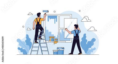 Scooter rental, vector flat style design illustration. Man and woman renting electric scooter, eco city transportation. E-scooter sharing service concept for web banner, website page, etc.