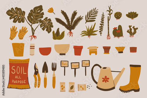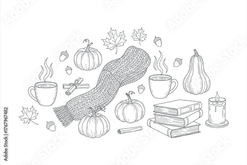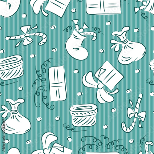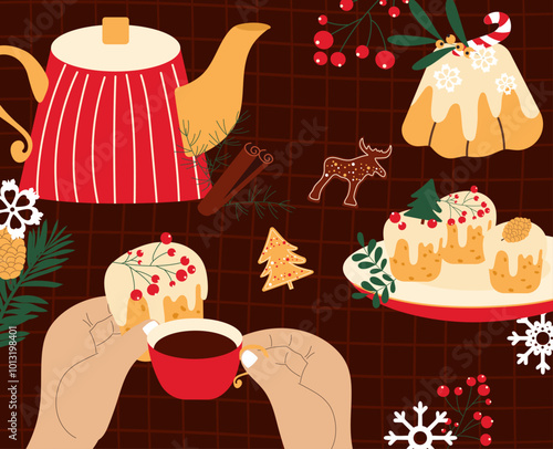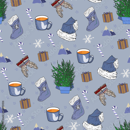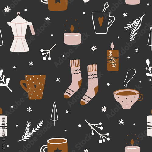 Seamless pattern with coffee and tea objects. Vector illustration background. French press coffee, tea pot, cups, cake and croissant.