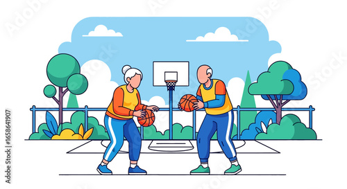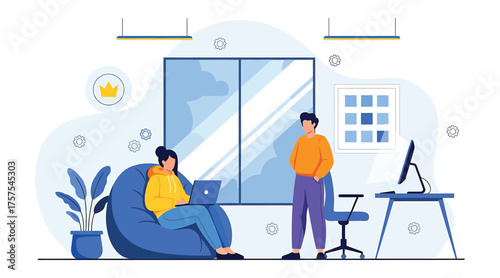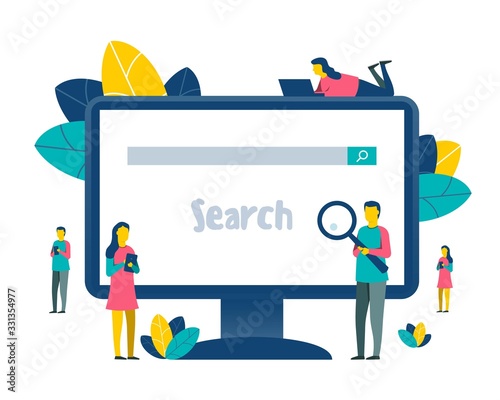 Atelier, garment factory, clothing workshop, vector flat style design illustration. Tiny characters woman seamstress sewing on big electric sewing machine, men holding button, thimble. Tailoring.