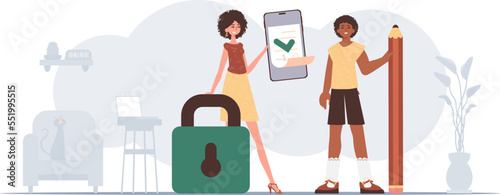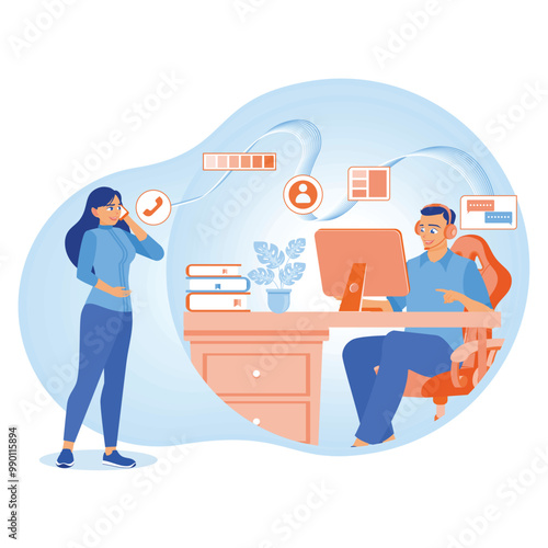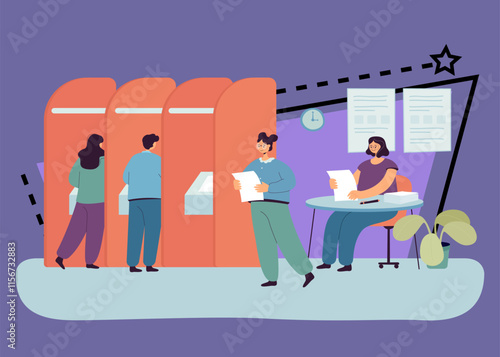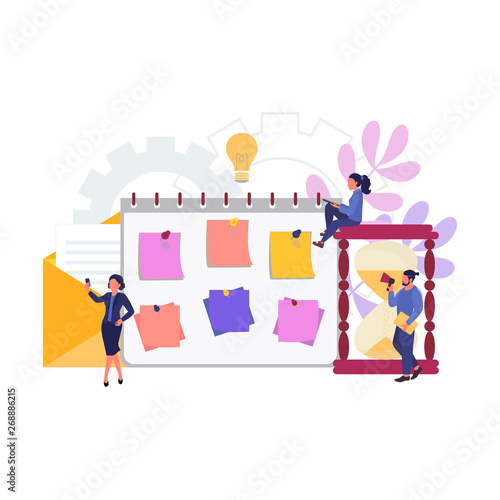Seamstress dressmaker tiny male female characters sewing apparel, vector flat illustration. Big sewing machine, scissors, thread, cushion with pins, thimble. Tailoring workshop, atelier fashion.