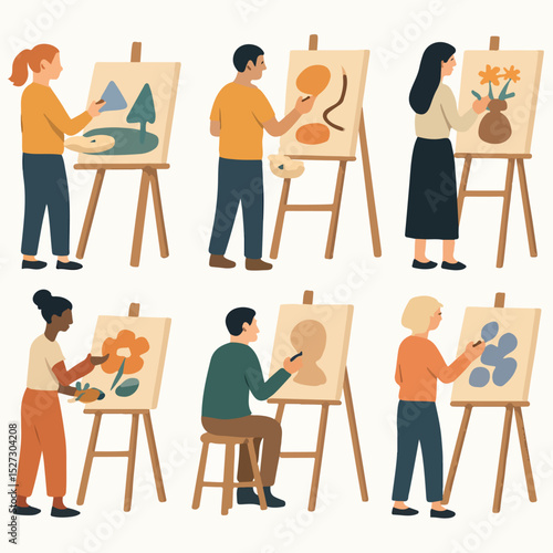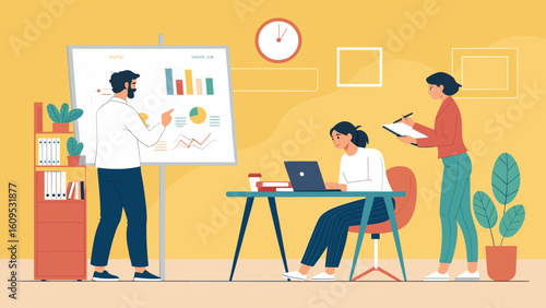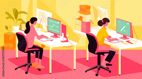 Seamstress team at fashion clothing factory workplace scene. Women working on sewing machines and taking measurements with tape vector illustration