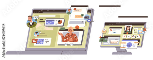 Entertainment cinema and travel ticket kiosks, supermarket self checkout, fast food restaurant self ordering kiosk, vector flat illustration isolated on white background. Self service technologies.