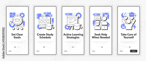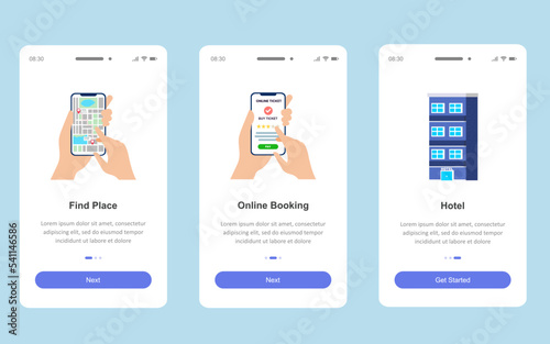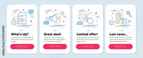 Self service mobile app onboarding screens. Menu banner vector template for website and application development. Supermarket self checkout, fast food restaurant and cinema self-service kiosks.