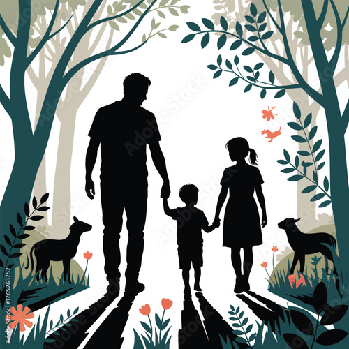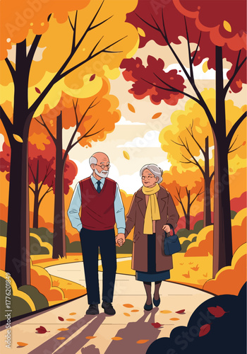 Senior couple walk in autumn park with dog. Old people active lifestyle concept vector poster. Romantic date of couple of senior people.