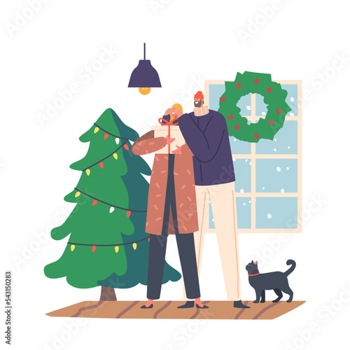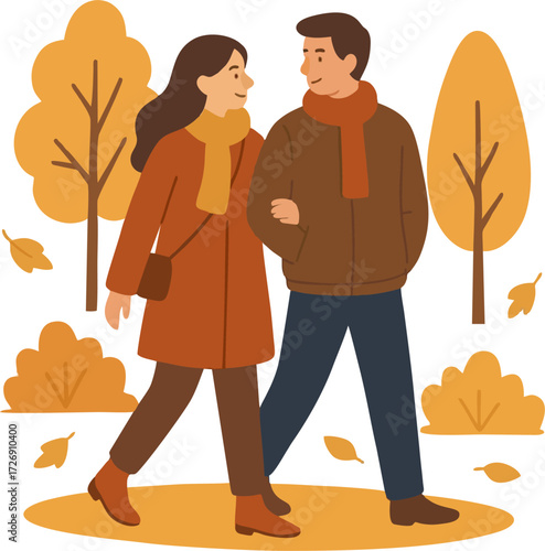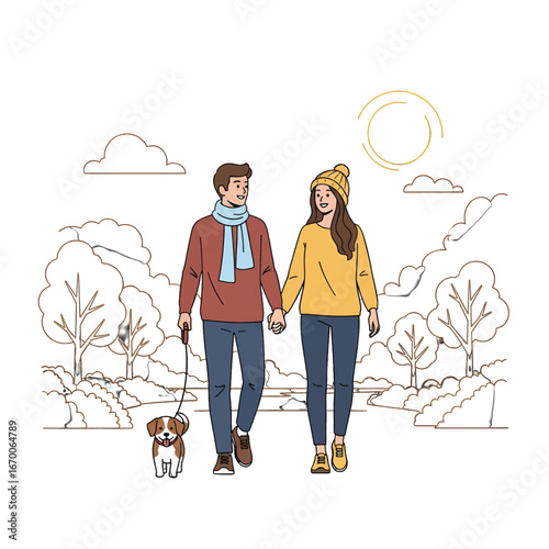 Senior couple walk in autumn park with dog. Old people active lifestyle concept vector poster. Romantic date of couple of senior people.